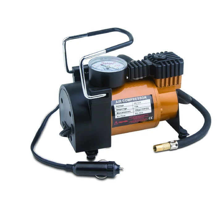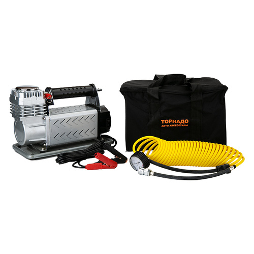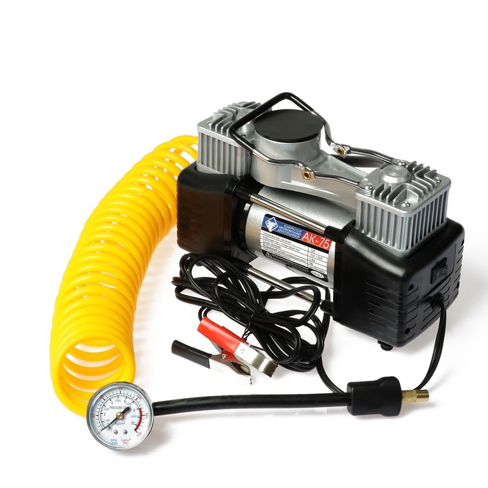 Соединение с шиной резьбовое, для контроля давления рядом встроен стрелочный манометр, проградуированный в кг/см2 и фунтах на дюйм. Мощный автомобильный компрессор на 12 вольт размещается на металлической платформе, что обеспечивает устойчивость и защиту от попадания грязи на корпус.