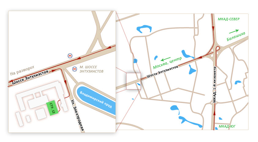 При движении в центр: по Шоссе Энтузиастов (Горьковскому шоссе из области), через 200 после пересечения с МКАД съезд на дублер ш.