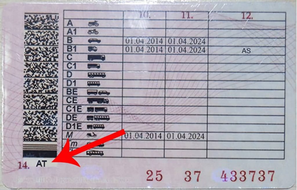 Используется вместо прав категории B. Это означает, что вы можете управлять только автомобилями с автоматической коробкой передач и не можете управлять автомобилем с механической коробкой передач.