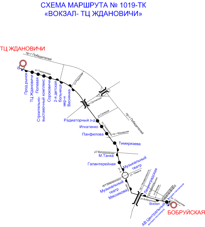 | Анжерская | Лесотехникум | Ж/д вокзал | Поликлиника | Западный переезд | Поликлиника | Ж/д вокзал | Лесотехникум | Анжерская |