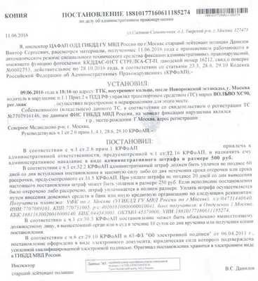В нашей ситуации в постановлении было указано, что нарушение сняла камера. Но о том, как именно — устройство работало в автоматическом режиме или фотографию сделал неравнодушный человек и отправил в МАДИ, — не было ни слова.