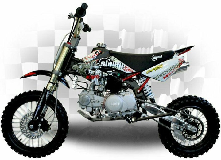 Питбайк. Модели с мотором объемом 125-140 см³ в среднем развивают максимальную скорость до 100 км/ч. Питбайки со 190-кубовым мотором быстрее – могут разогнаться до 120 км/ч.