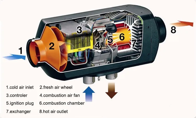 Принцип работы: отопитель состоит из 2-х контуров. В первом контуре в камере сгорания сгорает топливо (обычно дизельное), с улицы подаётся холодный воздух для поддержания процесса горения. Пламя нагревает теплообменник, с внешней стороны которого пропускается воздух, забранный из салона. В процессе его движения по второму контуру происходит его нагрев до заданных параметров. Им обогревается салон.